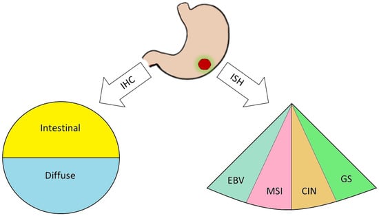 After tumor resection via surgery, the biopsy is processed through immunohistochemical (IHC) protocols, leading to a classical Lauren histopathological classification and/or exploiting in situ hybridization (ISH) techniques to evaluate EBV positivity (EBV), microsatellites instability (MSI), chromosomal instability (CIN), and genomical stability (GS).