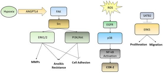Although several kinases pathways are deregulated in GC, we reported here three ways by which ERK1/2, PI3K/Akt, p38, and ERK5 are activated. Hypoxic condition may trigger, through the ANGPTL4/FAK/Src/ERK1/2–PI3K/Akt axis, events aimed to increase GC cells metastatic potential, such as induction of anoikis resistance, MMPs secretion, loosening of cell adhesion; ROS, influencing EGFR and p38, are able to activate NF-kB translocation into the nucleus leading to the transcription of COX-2 gene; SATB2, which is commonly downregulated in poor prognosis GC patients, being able to inhibit ERK5, is capable to decrease cell proliferation and migration, acting as a tumor suppressor transcription factor.