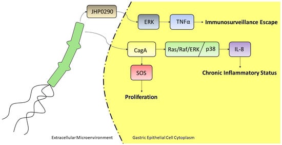 H. pylori may act as an oncogenic factor through several pathways and via many secreted proteins. In the above reported example, it is able to induce a chronic inflammatory status through the internalization of the CagA protein by gastric epithelial cells, which in turn triggers the upregulation of IL-8 via Ras/Raf/ERK or p38 pathway; such protein might also stimulate the Ras GTPase SOS, to induce cell proliferation. The secreted protein JHP0290 is able to induce TNFα transcription, mediated by ERK activation, leading to immunosurveillance escape.