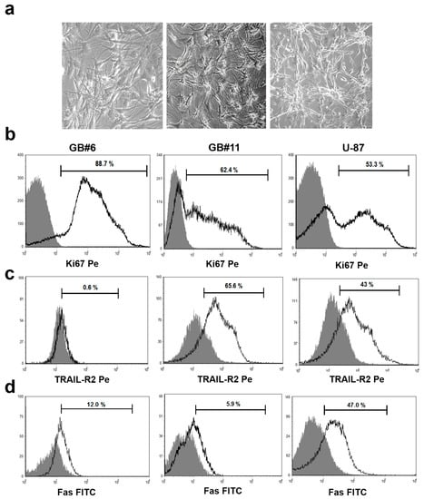 Glioblastoma cell lines derived from primary tumor cell cultures. (a) Figures show representative phase contrast images (×250 magnification) of cell lines derived from two primary glioblastoma cell cultures after 2–3 passages (left and middle panels) and human glioblastoma U-87 cells (right panel). (b–d) Flow cytometry histograms representing the expression of Ki-67 and TNF-family receptors (TRAIL-R2, Fas; bold-line histograms) and matched isotype controls (gray-filled histograms) in 2 of 13 cell lines derived from primary glioblastoma cell cultures (GB#6 and GB#11) after 2–3 passages (left and middle panels) and in human glioblastoma U-87 cells (right panel).