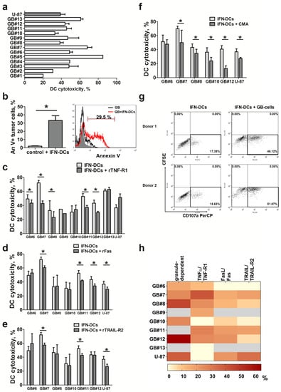 Cytotoxic activity of donor IFNα-induced DCs (IFN-DCs) against glioblastoma cell lines derived from primary tumor cell cultures. (a) Cytotoxic activity of healthy donor LPS-stimulated IFN-DCs against glioblastoma cell lines derived from primary tumor cell cultures (GB) is presented as mean (m ± SE; n = 3–15) or individual values (for GB#1, GB#2, GB#4, GB#5). (b) Percentages of Annexin V+ glioblastoma cells (GB#6 is shown as a representative cell line) shown in 5(6)-carboxyfluorescein diacetate N-succinimidyl ester (CFSE)+ gate in the absence (control) and presence of donor IFN-DCs (+ IFN-DCs) after co-culturing for 18 h at a 10:1 ratio (DCs: GB cells). Flow cytometry histogram shows data from one of five representative experiment. (c–f) The effect of soluble recombinant human TNF RI/TNFRSF1A Fc chimera protein (rTNFR1; c), recombinant ruman Fas/TNFRSF6/CD95 Fc chimera protein (rFas; (d)), recombinant human TRAIL R2/TNFRSF10B Fc chimera protein (rTRAIL-R2; (e)) and concanamycin A (CMA) (d) on cytotoxic activity of donor IFN-DCs against glioblastoma cell lines is shown as mean (m ± SE; n = 3–7) or individual values (for GB#9) in 24 h MTT-assay at a 1:1 ratio (effectors: target cells). (g) Flow cytometry dot plots represent two of four independent experiments; CD107a expression within CFSE-negative cell gate (IFN-DCs) is shown before and after co-culture with glioblastoma cell (GB#6) for 18 h at a 10:1 ratio (DCs: GB cells). (h) Heat map shows an inhibitory effect (median, percent) of rTNF-R1, rFas, rTRAIL-R2 and CMA on donor IFN-DC cytotoxicity. The inhibitory effect was calculated as [1-(DC(LPS+inhibitor)cytotoxicity/DCLPS cytotoxicity)] × 100%, where “inhibitor” indicates rTNF-R1, rFas, rTRAIL-R2 or CMA. Gray fields indicate that no analysis was performed. * p < 0.05 significant differences.