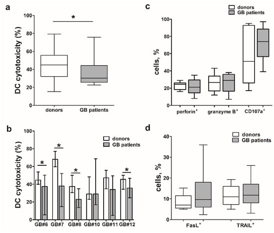 Inhibition of FasL/Fas-dependent pathway (Figure 2d) reduced donor DC cytotoxic activity against 3 of 6 cell lines tested (GB#7, GB#11 and GB#12). Median inhibitory effect of rFas on sensitive cells was 19.6%. The inhibitory effect of rFas on DC cytotoxicity was also observed in U87 cell cultures, which is consistent with the literature data on sensitivity of this cell line to FasL-dependent apoptosis [].