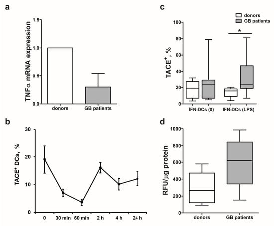 mTNFα expression also depends on the intensity of shedding and activity of a TNFα-converting enzyme (TACE/ADAM-17), which cleaves the extracellular part of mTNFα and converts it into biologically active secreted form of TNFα (sTNFα) []. Prior to comparing the expression of TACE/ADAM-17 in DCs from healthy donors and patients, we determined optimal checkpoints of enzyme detection in response to LPS stimulation (Figure 4b). An abrupt decrease in TACE/ADAM-17 levels was observed within the first 60 min after LPS was added to donor IFN-DC cultures. Subsequently, TACE/ADAM-17 expression levels increased reaching its maximum 2 h after stimulation initiation and then remained detectable up to 24 h of cultivation, followed by a gradual decrease. Based on the data obtained, we performed comparative analysis of TACE/ADAM-17 expression on IFN-DCs from healthy donors and glioblastoma patients 2 h after LPS treatment. Figure 4c shows that intact (LPS-unstimulated) DCs from patients were characterized by more pronounced expression of TACE/ADAM-17 enzyme, than donor DCs (p = 0.17). Moreover, TACE/ADAM-17 expression levels in LPS-stimulated DC cultures originated from patients were more than twofold higher, than healthy donor-derived DC (p = 0.035).