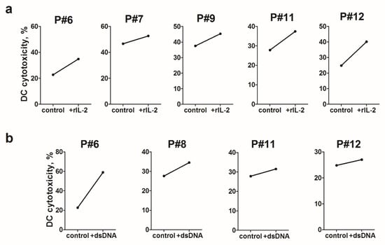 The effect of recombinant interleukin 2 (rIL-2) and human double-stranded DNA (dsDNA) on the cytotoxic activity of glioblastoma patient-derived IFN-DCs. Data are presented as individual values of patient-derived IFN-DC cytotoxic activity after stimulation with rIL-2 (a) or dsDNA (b) against autologous glioblastoma cell lines using MTT-assay at a ratio of effectors (DCs): targets (tumor cells) of 1:1.