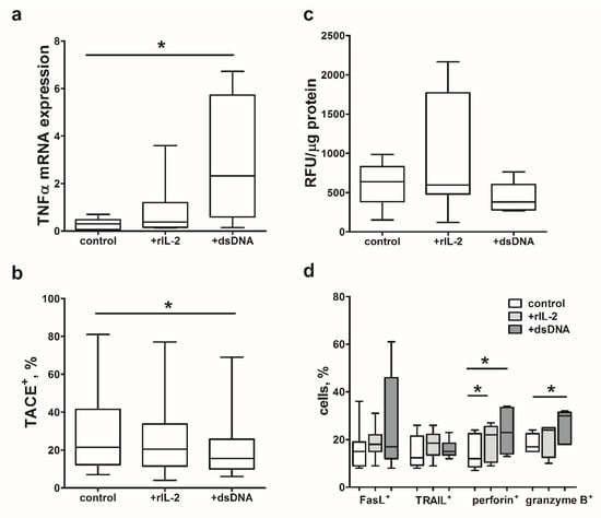 Effect of rIL-2 and dsDNA on glioblastoma patient-derived IFN-DCs. Data are presented as box and whisker plots (minimum to maximum values; median with interquartile range) of (a) TNFα mRNA expression, n = 9, (b,c) TACE/ADAM-17 expression (b, n = 7) and activity (c, n = 8), (d) surface (FasL, TRAIL, n = 8) and intracellular (perforin, granzyme B, n = 7) molecule expression (percentage of positively stained cells) in cultures of LPS-stimulated IFN-DCs (control) and stimulated with rIL-2 (+ rIL-2) or dsDNA (+ dsDNA) glioblastoma patient-derived IFN-DCs. * p < 0.05 significant differences.