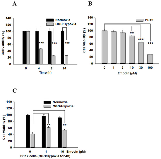 Emodin suppresses OGD/hypoxia-induced cell death in PC12 cells: Cell viability was determined by 3-(4,5-dimethylthiazol-2-yl)-2,5-diphenyltetrazolium bromide (MTT) assay. (A) Comparison of cell viability between normoxia and OGD-hypoxia at different time points. (B) Cell viability with different doses of Emodin. (C) The protective effect of Emodin under OGD/hypoxia. Data represent SEMs of three independent experiments. ** p < 0.01, *** p < 0.001 using Student’s t-test.