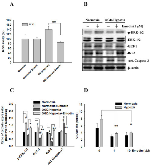 The effects of Emodin treatment of PC12 cells after OGD/Hypoxia on reactive oxygen species (ROS) production, glutamate release, and apoptosis are regulated through the extracellular signal-regulated kinase (ERK)-1/2 signaling pathway. (A) The protective effects of Emodin on ROS under OGD-hypoxia. (B) Phosphorylation levels of ERK-1/2 and the expression of GLT-1, Bcl-2, and activated caspase-3 (Act. Caspase-3) were examined by western blotting. (C) Bar graph showing semi-quantified densitometry. The ratio of p-ERK-1/2 was normalized to the levels of ERK-1/2 and β-Actin. (D) Glutamate was collected from cell culture medium after normoxia or OGD-hypoxia for 24 h and was detected with a colorimetric assay. The # and * indicate separate comparisons with normoxia and OGD-hypoxia conditions. * p, # p < 0.05 and ** p, ## p < 0.01 using Student’s t-test.