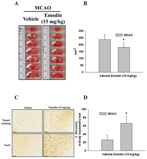 Emodin attenuates infarction sizes after middle cerebral artery occlusion (MCAO) in rats and improves the recovery in body asymmetry. (A) Brain sections were stained with 2,3,5-triphenyl-tetrazolium chloride (TTC) and (B) total volume of the infarction (the vehicle and emodin groups, n = 6 in each group. (C) Terminal Deoxynucleotidyl Transferase dUTP Nick End Labeling (TUNEL) and NeuN staining were observed in brain slices following ischemia/reperfusion injury. Scale bar = 100 μm (D) Body asymmetry was tested after MCAO surgery. Data represent SEMs of three independent experiments. * p < 0.05 using Student’s t-test.
