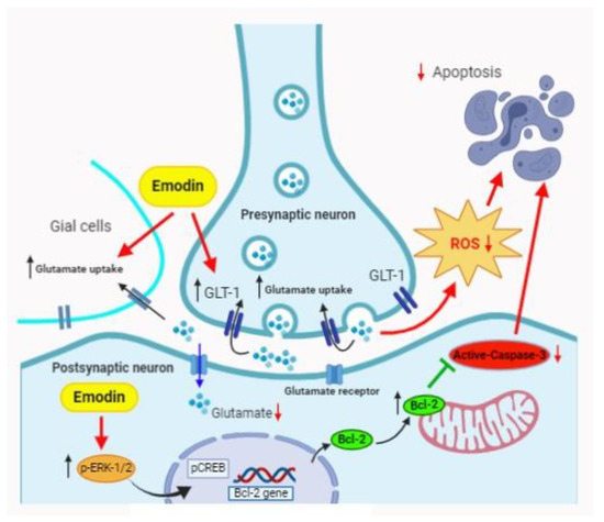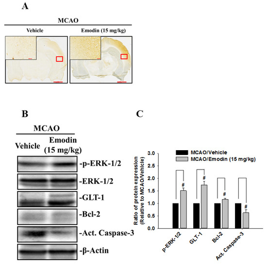 GLT-1 is responsible for the vast majority of functional uptake of extracellular glutamate in the central nervous system. Thus, GLT-1 expression was examined by immunohistochemical staining of rat brain slices (Figure 4A). GLT1 protein expression was higher in Emodin-treated rats than in nontreated rats (Figure 4B). In addition, expressions of p-ERK and Bcl2 increased in Emodin-treated rats while expression of active caspase-3 decreased expectantly (Figure 4B,C).