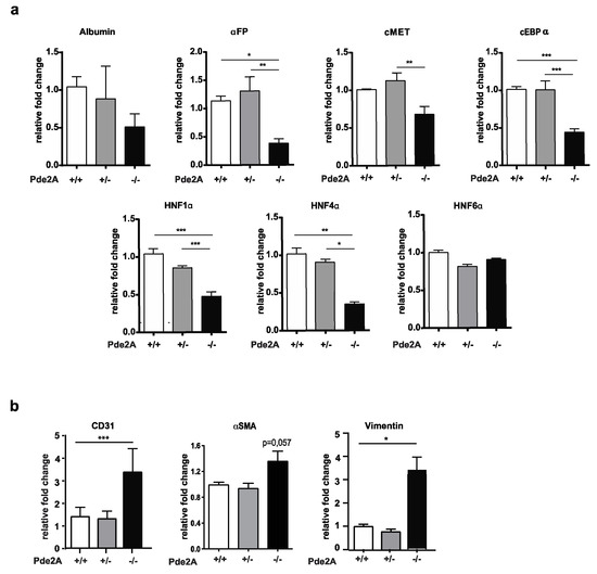 2.2. Hepatic Markers Are Reduced Whereas Stromal and Endothelial Markers Are Increased in Liver Of PDE2A Mutant