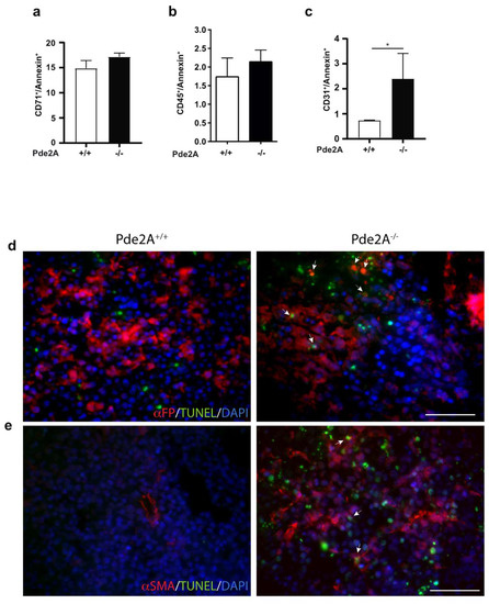 The niche is compromised in liver of PDE2A−/− embryos. (a–c) Flow cytometry analysis of liver cells isolated from E14.5 PDE2A+/+ and PDE2A−/− embryos, stained with Annexin-V and antibodies against CD71 (a), CD45 (b), CD31 (c) markers. Histogram showing the percentage of double stained cells reveals an increase of endothelial cell apoptosis in PDE2A−/− embryos. N = 3 embryos/genotype. * P < 0.05. (d,e) Immunofluorescence of E14.5 liver sections stained with α-FP and α-SMA antibodies (red) and with TUNEL assay. Nuclei were counterstained with DAPI (blue). Arrows indicate double stained cells. Scale bar 50 µm. N = 3 embryos/genotype.