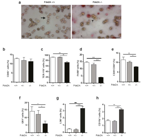 In mouse embryos between E11.5 and E16.5, the liver is the primary hematopoietic organ [14,15]. Blood smears obtained from E14.5 normal peripheral blood display a great number of mature non-nucleated erythroid cells, which are mainly liver derived. In blood smears obtained from PDE2A−/− embryos, erythroid cells are still predominantly nucleated and hence immature. Most likely, they are remnants of yolk sac origin suggesting an impairment of erythropoiesis in PDE2A−/− embryos (Figure 5a). Furthermore, the number of blood cells collected from the umbilical cord of PDE2A−/− embryos revealed a 4.5-fold reduction compared to PDE2A+/+.