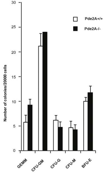 To further confirm this hypothesis, we compared the capacity of PDE2A−/− and PDE2A+/+ hematopoietic progenitor cells of livers from E14.5 to develop into the erythroid and myeloid lineages in an in vitro methylcellulose colony assay [22]. The number of erythroid and myeloid colonies obtained from the two genotypes after 7 days of culture was equivalent (Figure 6), indicating that PDE2A−/− hematopoietic stem cells are able to proliferate and differentiate when tested in vitro under proper conditions and even though originating from severely hypoplastic and immature livers, give rise to all canonical hematopoietic lineages.