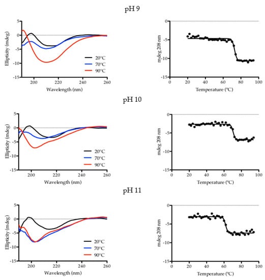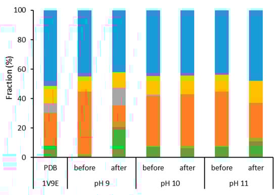 After heating until 94 °C, the protein was analyzed again at 20 °C, and it is possible to observe that, at pH 9 and pH 11, the changes in the CD spectra caused by heating are maintained and, at pH 10, BCA seems to revert to a CD profile similar to the initial one (Figure S1). This correlates to the changes in the secondary structure (Figure 2) where it is possible to observe that, under pH 9 and pH 11, the BCA structure changes more significantly due to the decrease in the antiparallel β-sheet portion (in orange), and due to the increase in the α-helix (green) at pH 9. On the other hand, at pH 10, the structure seemed to be less damaged by the temperature ramp, with a slightly lower content of parallel β-sheet than the original protein (PDB reference). Altogether, these observations indicate that the changes in secondary structure are more permanent at pH 9 and pH 11. At pH 10, the denaturation of the enzyme is more reversible.
