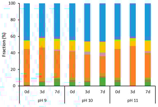 The protein stability was also assessed during incubation at 30 °C, under the three pH conditions (Figure 3). In this set of data, only slight changes in the proportion of the fractions as well as in CD spectra (Figure S2) were observed in all cases.