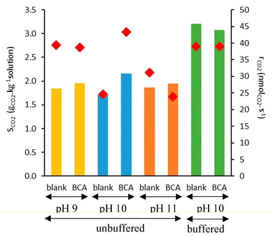 The influence of pH on the BCA performance for CO2 absorption was kinetically investigated through online monitoring of pressure decay as a result of the gas (CO2) capture in the aqueous phase (Figure S3). As shown in Figure 5, the addition of BCA to each test condition had a low influence on the overall sorption coefficient (SCO2), determined at equilibrium. However, under unbuffered conditions, the presence of the enzyme speeds up the initial capture rate (rCO2) by 76% (at pH 10). No positive effect was observed at pH 9 as well as at pH 11. The best pH condition observed in the present study was within the range reported by Wojtasik et al. [] (pH 10–10.3) during CO2 capture in a 30 wt% methyldiethanolamine (MDEA) solution. When considering a buffered environment, the observation was that SCO2 was increased by 35% in the presence of the enzyme, as compared to an unbuffered condition at the same initial pH. The enzyme, however, did not exert a positive influence for the buffered condition, as compared to the use of buffer in the absence of BCA (blank assay). This may be related to the possibility of CA action toward CO2 hydration products (reversibility of the reaction, as shown in Reactions (R1) and (R2)), so that the overall effect might have been neutralized in this condition.