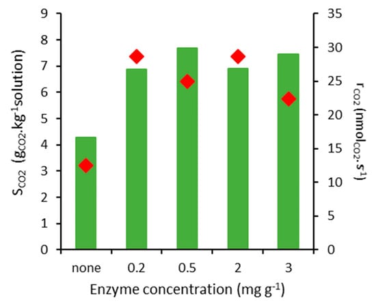 Regarding the effect of enzyme concentration in the absorption performance, it is possible to observe from Figure 6 that low biocatalyst concentrations are sufficient to favour the absorption, and higher concentrations do not seem to improve the reaction yield. A similar pattern was observed during biocatalytic CO2 absorption in other alkaline conditions with a linear performance increase at low enzyme concentrations (<0.5 g L−1) and subsequent asymptotic deviation at higher concentrations [,,]. When calculating the specific absorption as a function of the enzyme amount added (and excluding any contribution of water), it is clear that the most interesting condition is obtained with 0.2 mg g−1 of the enzyme (Table 4), which is attractive from an economic point of view.