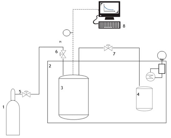 Set up of CO2 sorption tests. (1) CO2 cylinder, (2) water bath, (3) gas storage cell, (4) absorption cell, (5–7) manual control valves, and (8) computer.