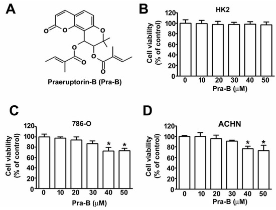 Figure 1. Effects of Praeruptorin B (Pra-B) on cell viability of human renal cell carcinoma (RCC) cells and normal HK2 cells. (A) Structure of praeruptorin B (Pra-B); (BD) cell viability of proximal tubule normal HK2 cells and RCC cell lines 786-O and ACHN treated with various concentrations of Pra-B (0, 10, 20, 30, 40, and 50 μM) for 24 h. * p < 0.05 relative to the control. Data are presented in terms of mean ± SD, as determined in at least three independent experiments.