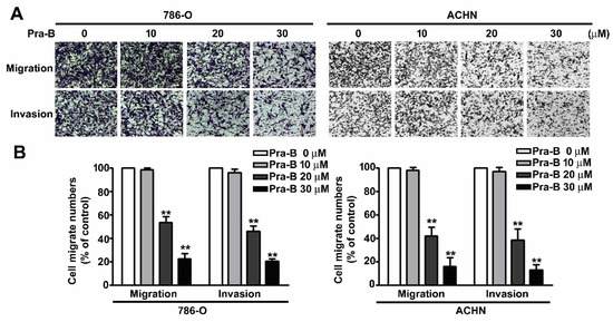Figure 2. Inhibitory effects of Pra-B on cell migration and invasion of 786-0 and ACHN cell. (A) Cells were treated with various concentrations of Pra-B (0, 10, 20, and 30 μM) for 24 h followed by the analysis of 786-0 and ACHN cell migration and invasion by using an in vitro migration and Matrigel-based invasion assay. (B) Quantification of migrating cells presented in terms of percentage of control (0 μM) is shown as a histogram, as determined in at least three independent experiments. ** p < 0.01 relative to the control. Scale bar = 50 μm.