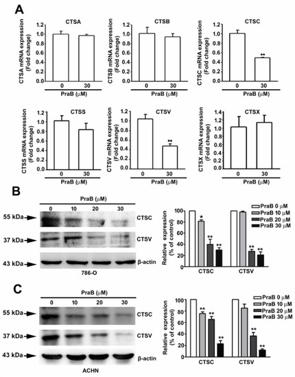 Cathepsin-related proteins have been broadly implicated in cancer [23], and we even previously reported CTSC as being a target in the suppression of RCC migration and invasion [24]. To identify the effect of Pra-B on CTS-related mRNA expression, we treated 786-O cells with Pra-B (30 μM) for 24 h and used qRT-PCR analysis to screen the expression of CTS-related gene expression. The results indicated that the mRNA expression of CTSC and CTSV was significantly reduced in response to Pra-B treatment (Figure 3A). Furthermore, Western blot analysis also demonstrated that the protein expression of CTSC and CTSV was reduced upon Pra-B treatment in 786-O and ACHN cells (Figure 3B,C).