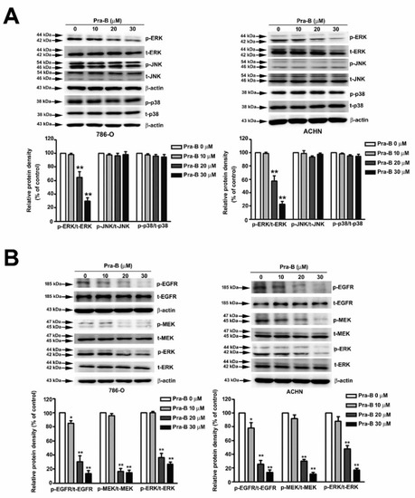 Figure 4. Pra-B suppressed epidermal growth factor receptor (EGFR)–MEK–ERK activation in 786-O and ACHN cells. (A) 786-O and ACHN cells were treated with various concentrations of Pra-B (0, 10, 20, and 30 μM) for 24 h, after which the cells were harvested to detect MAPKs-related proteins (p-ERK, t-ERK, p-JNK, t-JNK, p-p38, t-p38) and (B) the p-EGFR, t-EGFR, p-MEK, t-MEK, p-ERK, t-ERK protein expression levels through immunoblotting. The histogram represents the densitometric analysis of protein expression. β-actin was used as the loading control. * p < 0.05, ** p < 0.01 relative to the control. Data are presented in terms of mean ± SD, as determined in at least three independent experiments.