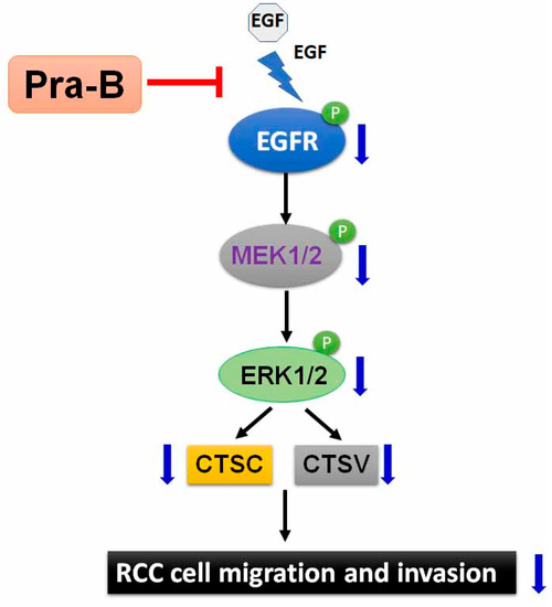 In this study, we investigate the inhibitory effect of Pra-B on migration and invasion in RCC and further identify underlying molecular mechanisms for these effects. Our results demonstrated that Pra-B suppressed cellular motility through reducing the mRNA and protein expression of CTSC/CTSV and suppressing the EGFR–MEK–ERK signaling pathway. This suggested that Pra-B has potential as an antimetastatic agent in human RCC cells.