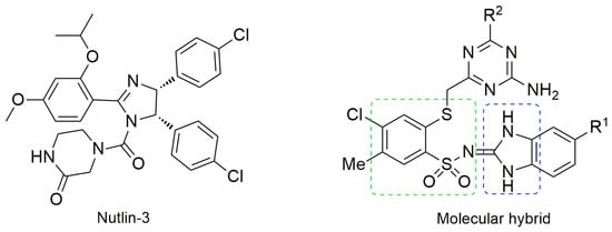 Our previous works on a search for antitumor agents among benzenesulfonamide derivatives, carried out by Sławinski’s group, indicate the importance of the 2-methylthiobenzenesulfonamide fragment for cytotoxic activity of compounds against cervical, breast and colon cancer. We have proved that our compounds showed an apoptotic effect in cancer cells. Continuing the search for more active compounds, we designed and developed a method for the synthesis of new molecules with potential inhibitory activity against the MDM2 protein. We carried out molecular docking for various targets associated with tumors that showed the affinity of designed compounds for MDM2. In this work, we report on a series of 2-[(4-amino-6-R2-1,3,5-triazin-2-yl)methylthio]- -4-chloro-5-methyl-N-(5-R1-1H-benzo[d]imidazol-2(3H)-ylidene)benzenesulfonamides designed as molecular hybrids combining the 2-mercaptobenzenosulfonamide fragment with the imidazoline ring (Figure 1). In the structure of our compounds, we also incorporated different substituents R2 to investigate their impact on anticancer activity and establish structure-activity relationships. All compounds were tested for their cytotoxic activity against HCT-116, MCF-7 and HeLa cell lines.