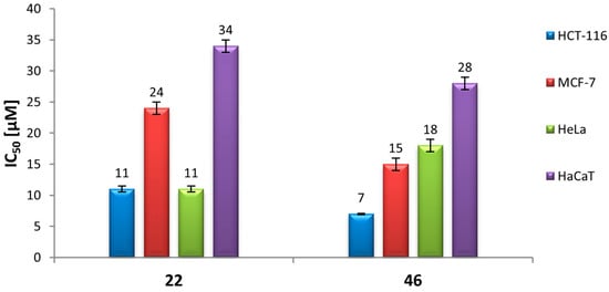 The graph presents a comparison of the most active compounds 22 and 46 with the non-cancerous HaCaT cell line.