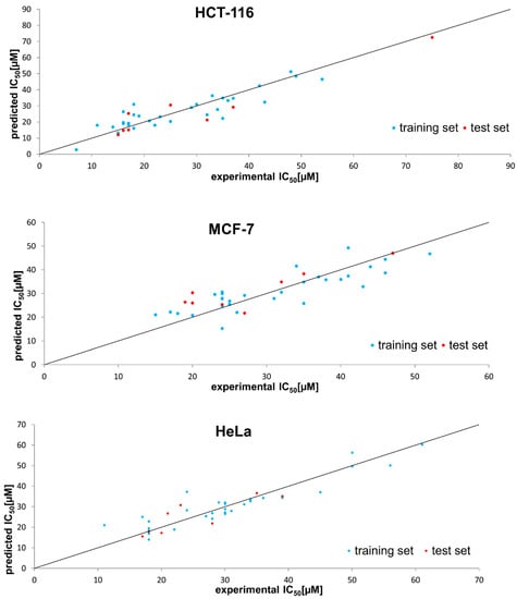 The obtained models correlated cytotoxic activity (IC50) toward cancer cells with different topological (2D) and conformational (3D) molecular descriptors. The equations were statistically significant, they explained 75–86% of the variability of the IC50 coefficient and were characterized by usefulness of model to predict the antitumor activity of new sulfonamides, as indicated by the values of Q2 from 68% to 75% (Table 2 and Figure 3).