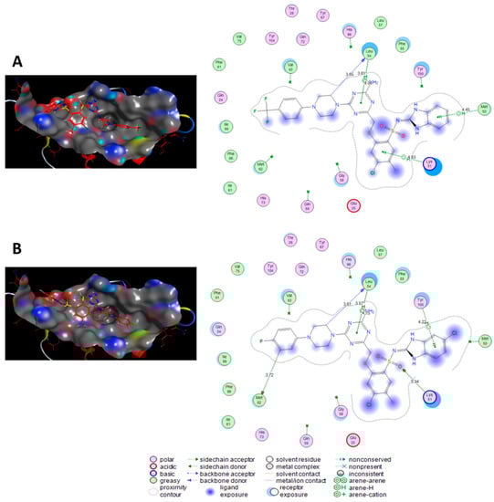 3D and 2D representations of the protein–ligand interaction of compounds (A) 22, and (B) 46 inside the active site of MDM2. Left side of figure: carbon and oxygen—red, nitrogen—blue, hydrogen—grey, sulfur—yellow, chlorine and fluorine—green.