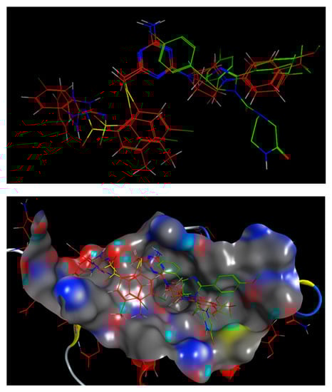 Docking of the most active compounds 22, 46 was performed and showed proper fitting in the active site of MDM2 with positive energy scores (S), which supports the observed activity of these compounds as MDM2 inhibitors. The energy score (S) and amino acid interaction of the most potent MDM2 inhibitors are listed in Table 3. The docking results revealed that the amino acids Leu54 and Met62 located in the binding pocket of the protein played an important role. Thus, the most active compounds (22, 46) showed interaction with Leu54 and Met62 formed π-H interaction with Leu54 and/or H-bond donor with Met62, which mimics the pattern of interaction of Nutlin-3a with the MDM2 protein (Figure 4). Interestingly, the 2-(4-phenylpiperazin-1-yl)-1,3,5-triazine fragment is located in a hydrophobic binding pocket near amino acid residues Met62, Leu54, Val93, Gly58, and Gln59, interacting directly with the most important residues Leu54 and Met62 (Figure 5). Apparently, compounds 22 and 46 showed the same orientation within the active site of MDM2, suggesting the binding pattern of these derivatives within the MDM2 protein (Figure 6). The remaining parts of the molecules, i.e., the benzenesulfonamide fragment and the benzimidazole ring occupy other regions of the protein by interacting with the amino acids Lys51 or Met50, as well Tyr100, respectively. Based on the characterization of the protein–ligand interactions, the 4-phenylpiperazin-1-yl moiety played a key role in forming a H-bond interaction, while both 1,3,5-triazine and benzimidazole rings were responsible for π-H (polar) and aromatic π-π stacking noncovalent interactions (Table 3).