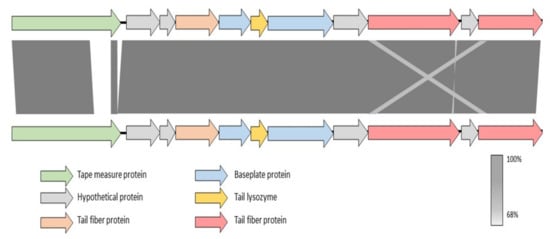 - Adriaenssens, E.M.; Edwards, R.; Nash, J.H.E.; Mahadevan, P.; Seto, D.; Ackermann, H.-W.; Lavigne, R.; Kropinski, A.M. Integration of genomic and proteomic analyses in the classification of the Siphoviridae family. Virology 2015, 477, 144–154. [Google Scholar] [CrossRef]