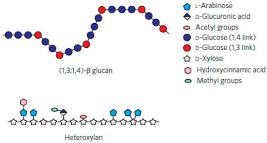 - Buckeridge, M.S.; Rayon, C.; Urbanowicz, B.; Tine, M.A.S.; Carpita, N.C. Mixed linkage (1,3;1,4)-beta-D-glucans of grasses. Cereal Chem. 2004, 81, 115–127. [Google Scholar] [CrossRef]