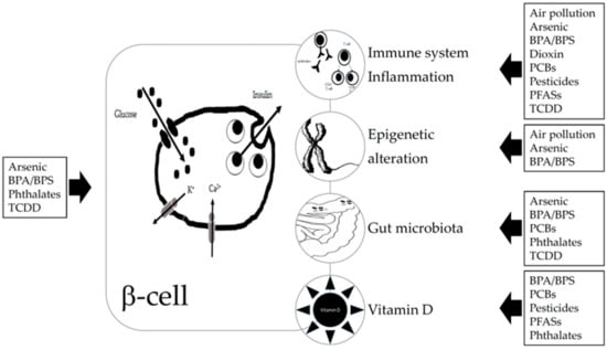EDCs can accelerate T1D development by several mechanism of action on known T1D triggers, such as immunomodulation, gut microbiota, and vitamin D pathway []. Here we briefly report on these direct pathogenetic mechanisms.
