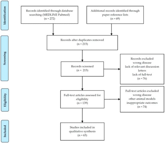 Overall, 215 papers were initially identified. After the screening of titles and abstracts, a total of 150 articles were discarded, leaving 65 articles to be analyzed. Full-text assessment of these articles was available for all eligible articles. Figure 2 displays the process of selection of studies.