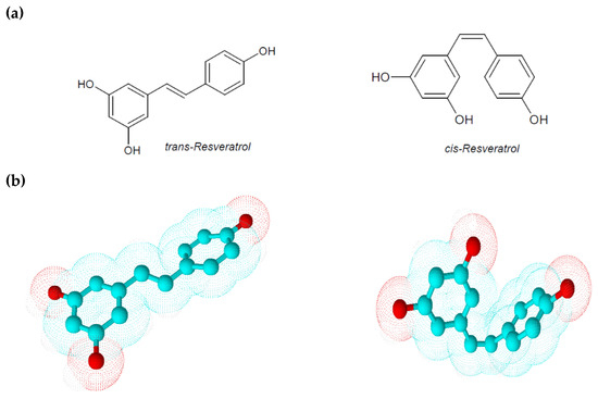 (a) Chemical structures of trans-resveratrol and cis-resveratrol; (b) 3D chemical structures of trans-resveratrol and cis-resveratrol.