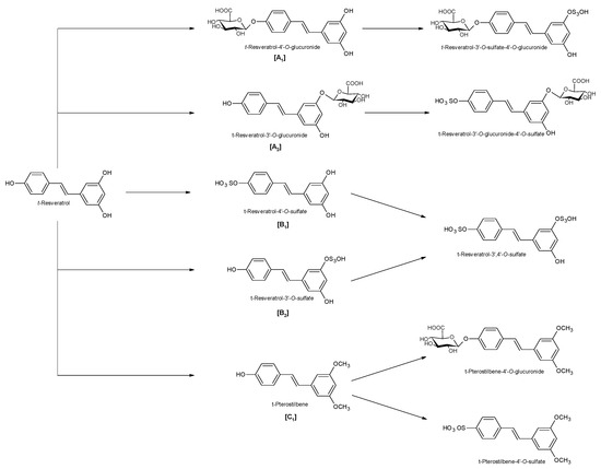 Phase II metabolism of trans-resveratrol. [A1]: 4′-glucuronic conjugation; [A2]: 3-glucuronic conjugation; [B1]: 4′-sulfate conjugation; [B2]: 3-sulfate conjugation; [C1]: 3,5-dimethyl conjugation.