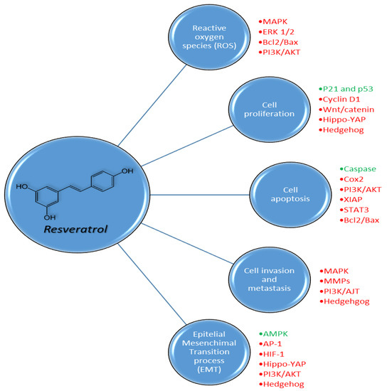 Pleiotropic biochemical effects of resveratrol on reactive oxygen species (ROS), cell proliferation, cell apoptosis, cell invasion and metastasis and epithelial mesenchymal transition processes in cancer cells through the activation (green) or inhibition (red) of different pathways.