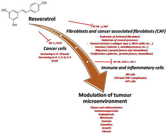 Multiple effects of resveratrol on the tumor microenvironment through the inhibition of many pro-inflammatory mediators and cytokines involved in cancer cell survival, in cancer-associated fibroblast activation and modulation of immune cells resident in tumor tissue.