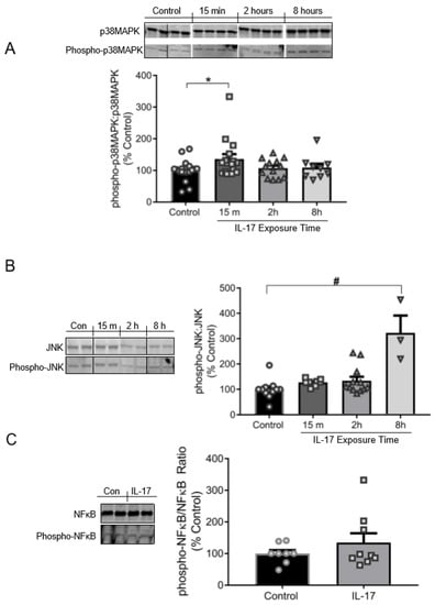 3.3. IL-17 Induces the Phosphorylation of p38MAPK and JNK, but Not NFκB