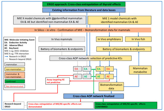 ERGO was built in response to these needs and a respective EU H2020 call (see above). In the ERGO consortium, there are several partners with long-lasting expertise with work on the endocrine system of different vertebrates. As described above, evidence in the peer-reviewed literature supports the conservation of large parts of the vertebrate endocrine system, and this evidence is growing fast, particularly because of a focus on AOP development and increasing knowledge about ED modes of actions (MOA), including in silico modelling, biotransformation and transcriptomics data. This proof of conservation of the endocrine system on the one hand and the separated testing strategies on the other was the basic motivation for ERGO to develop the AOP network based on a cross-vertebrate class effects approach. The thyroid system was selected due to reasons already outlined, however cross-talk investigations with other conserved endocrine axes like the hypothalamus pituitary gonadal (HPG) axis could be included in the cross-class approach in the future as well [45].