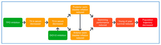 Figure 2. Putative AOP network for deiodinase (DIO) and thyroperoxidase (TPO) inhibition, leading to impaired swim bladder inflation in fish. DIO inhibition causes triiodothyronine (T3) serum decrease and reduced anterior swim bladder inflation, with reduced swimming performance and survival as adverse consequences. https://aopwiki.org/aops/155-159.