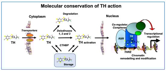 Figure 3. Conservation of TH signaling in vertebrates. Processes from TH transport into the cell to control of gene expression share homologous proteins and mechanisms in humans, fish and amphibians. Homologous TH transporters enable TH entry into cells, where deiodinases function to activate or deactivate it. Cytoplasmic TH binding proteins (CTHBPs) modulate cytoplasmic availability. In the nucleus, the TH receptor (TR) forms a heterodimer with the retinoid X receptor (RXR) and binds to DNA at TH response elements (THRE), where co-regulator complexes are recruited to alter the state of chromatin, ultimately leading to induced expression of TH response genes. Modified from [27].