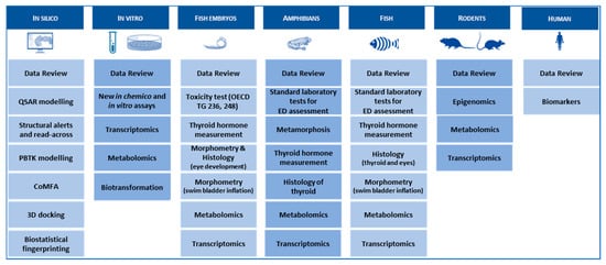 Nonetheless, as reported by [21], even EU REACH (Registration, Evaluation, Authorization and Restriction of Chemicals) dossiers of high tonnage chemicals (above 100 and 1000 tonnes/year) are lacking measured developmental toxicity data. Often, animal tests have been waived through read-across and the exploitation of existing data, but not by employing alternative test methods [22]. Additionally, ED-related endpoints and effects regarding the environment are still missing in REACH standard data requirements. With respect to this, it is currently discussed to amend the REACH standard data sets, to explicitly cover the ED mode of actions and correlated adverse effects. To efficiently cover ED in the tiered REACH testing approach, it is of utmost importance to use human health data for environmental assessment and vice versa. According to the OECD conceptual framework (CF) [23], only in vivo animal tests are able to identify adverse effects induced by ED pathways. In addition to the ethical aspects of using animals, such in vivo tests are lengthy and expensive. Moreover, testing on animals (as defined by Dir. 2010/63/UE) is not allowed in Europe (and some other countries) for the safety assessment of cosmetic ingredients and low tonnage chemicals (less than 10 tonnes/year), which must rely on alternative methods. Consequently, these compounds can only be tested with OECD conceptual framework (CF) level 2 (in vitro) and some level 3 tests (fish and amphibian early life stages). The latter provide data about endocrine mechanisms, but are currently not designed to detect population-relevant adverse effects (AE).