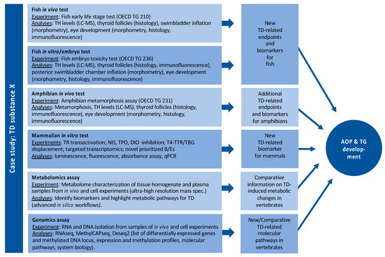 Together with already existing literature data, ERGO will provide a comprehensive data set to demonstrate that fish, i.e., zebrafish, are a fully adequate and effective model to assess THD effects and extrapolate the results to other vertebrate classes including humans. Similar data sets are currently being generated for amphibians, as over many years, the amphibian model organism Xenopus (laevis and tropicalis) has contributed fundamentally to research in biomedicine, neurobiology, physiology, molecular biology, cell biology, and developmental biology, making it one of the best investigated animal models [42,43]. The frog model has provided major insight into in vivo mechanisms of TH signaling [44], since TH-dependent developmental changes like metamorphosis are directly observable and quantifiable. The extreme sensitivity and responsiveness of amphibian metamorphosis to TH signaling is exploited in OECD TGs 231, 241 and 248.