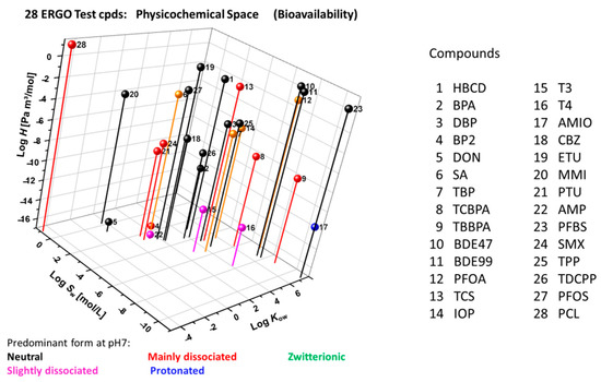 According to EPISuite [51] and ACD/Percepta [52] calculations (Figure 6), the approximate property ranges of the ERGO reference set of compounds (Appendix A) are as follows: log Kow (hydrophobicity, octanol-water partition coefficient) from −5 to 8, log H (Henry’s law constant, [Pa m3 mol−1]) from −17 to 1, log Sw (water solubility, [mol L−1]) from −11 to 1), and pKa (dissociation constant), indicating the predominant speciation at pH 7. This wide physicochemical profile addresses potential in vitro challenges regarding sorption, volatilization and resultant bioavailability.