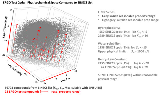 Figure 7. ERGO vs. EINECS physicochemical domain in terms of log Kow (octanol-water partition coefficient), log H (Henry’s law constant) and log Sw (water solubility), as calculated through EPISuite [51]. Among 100,102 EINECS entries, 72,520 have defined chemical structures, of which 56,703 compounds with formally valid EIPSuite results (grey) are compared to the 28 ERGO reference compounds (red). EINECS compounds with calculated properties outside reasonable ranges are plotted in the property edges (light grey).
