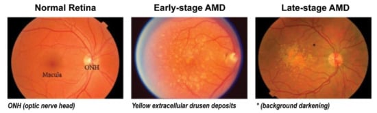 Clinical stages of age-related macular degeneration (AMD). Early-stage AMD shows yellow extracellular drusen deposits surrounding macular area. Late-stage AMD shows hypopigmentation or background darkening (*) around drusen, and a large number of drusen deposits are observed accumulated in the macular area. Adapted with permission from Jiangyuan et al. [].