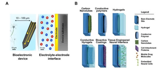 Schematic of tissue–electrode interfaces. (A) The electrodes of bioelectronic devices are usually implanted within 100 μm of the target tissue, and exchange of electronic signals occurs at a nanoscale electrolyte–electrode interface. Adapted with permission from Hyunwoo et al. []. (B) Application of various non-metallic material coating technologies as electrode interface, includes bare electrode site, hydrogel, conductive polymer, carbon nanotubes, cell attachment proteins, mobile drug molecules, and embedded neural cells. Adapted with permission from Aregueta-Robles et al. [].